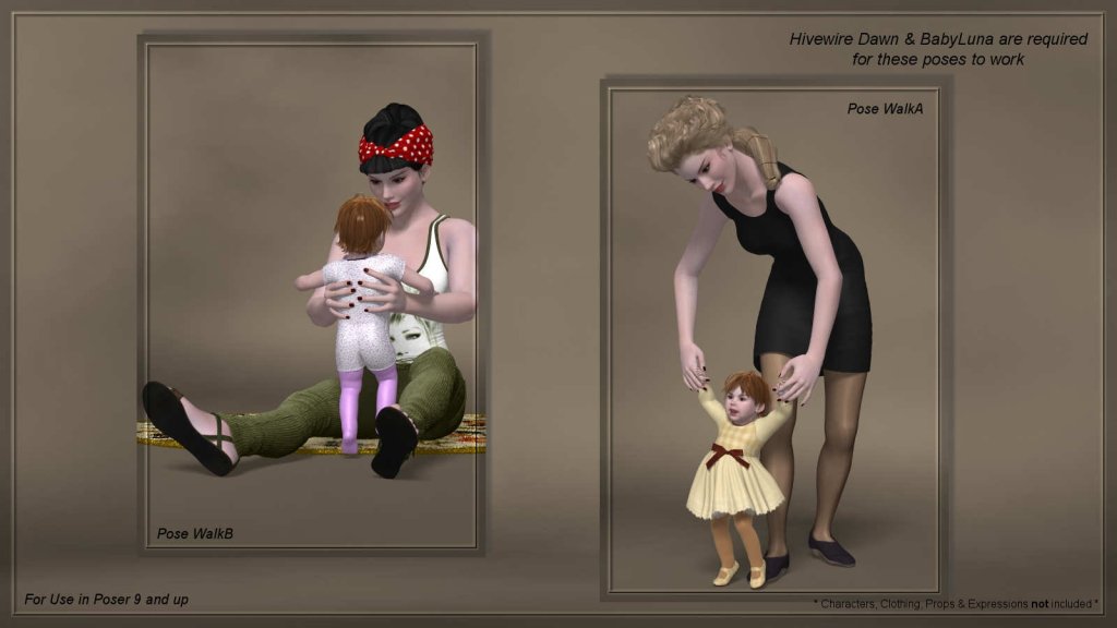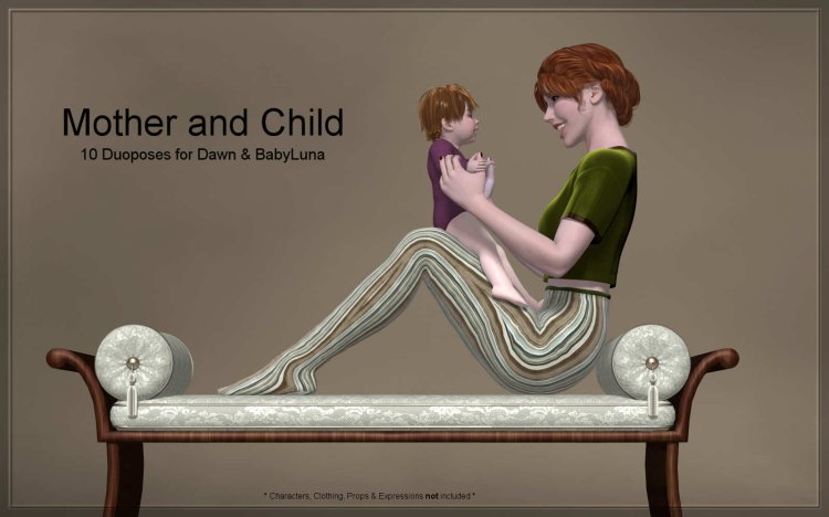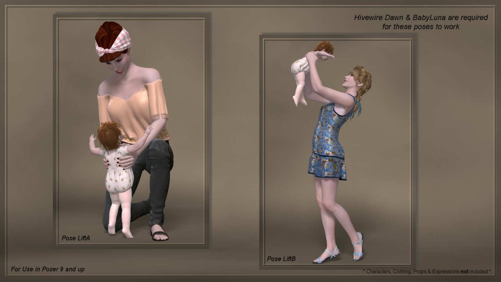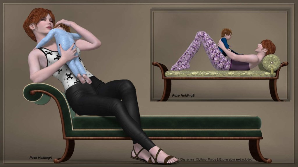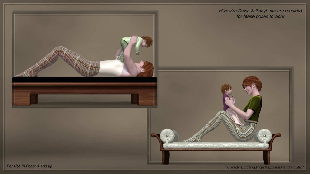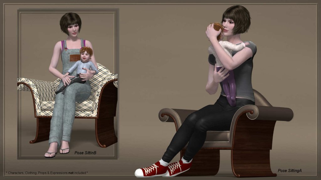 These are poses for the daily situations that come with being a multi-tasking mother. These poses were created to be as realistic and as detailed as possible. You will find 10 duo-poses, plus defaults, for Dawn and Baby Luna.