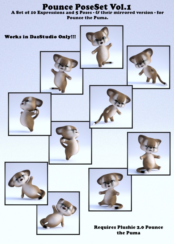 5 Poses & their mirrored version plus 10 expressions for Pounce. Requires Plushie 2.0 Pounce the Puma by LadyLittlefox – available at Daz3D. Compatible with DazStudio only!